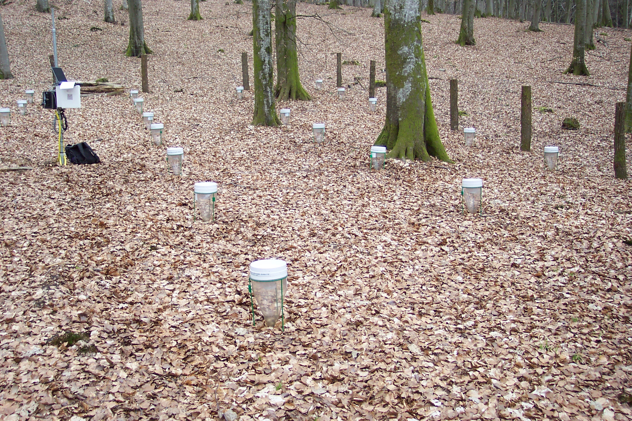 Experimental setup measuring rainfall throughfall in a forest.